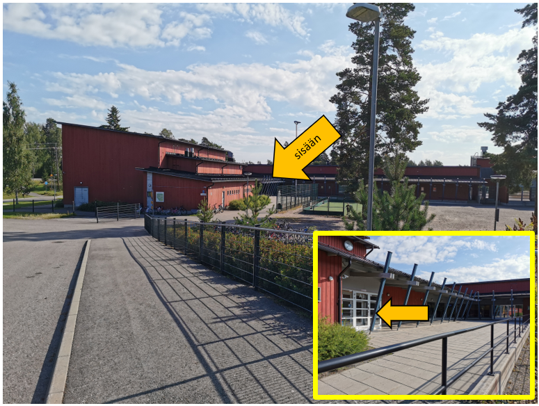 Pukuhuonejako (tytöt/pojat) on merkitty pukuhuoneiden oviin. Poikien pukuhuone löytyy käytävän päästä.
